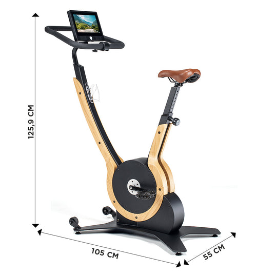 La console tactile HD permet l'accès à des applications telles que Netflix, YouTube, Spotify et Kinomap, pour des entraînements interactifs. La selle en cuir avec gel intégré et le pédalier silencieux assurent un confort optimal.