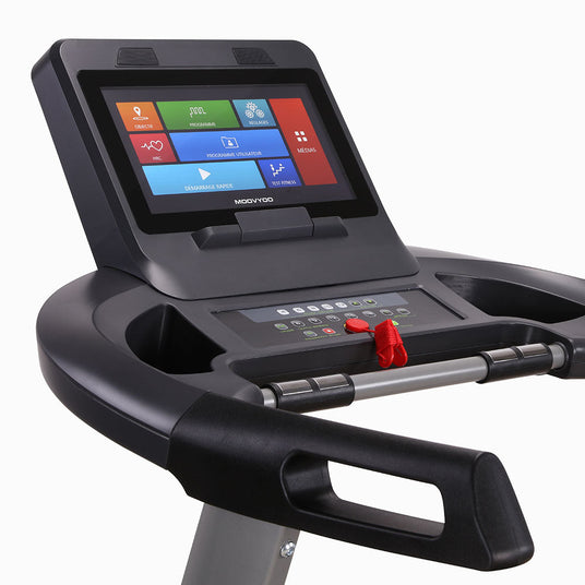 Le tapis de course Moovyoo Lynx Konect 2.0 est un modèle avec une grande surface de course de 152 x 51 cm, idéale pour les entraînements intensifs.